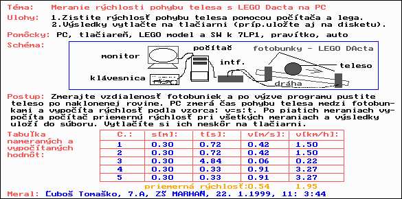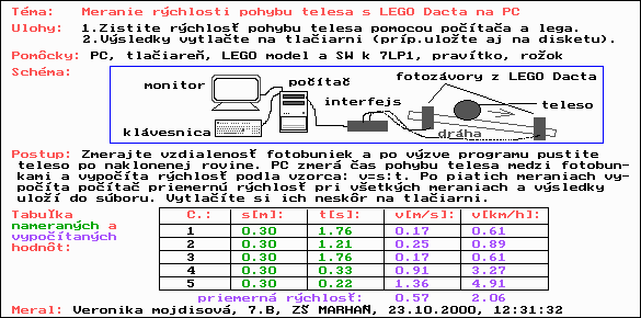 Po meraní, ktoré vykonáva pomocou počítača a modelu z LEGO Dacta každý žiak sám, si žiaci uložia grafický súbor na svoju disketu, vytlačia ho na tlačiarni a vlepia do zošita ako doklad o meraní.